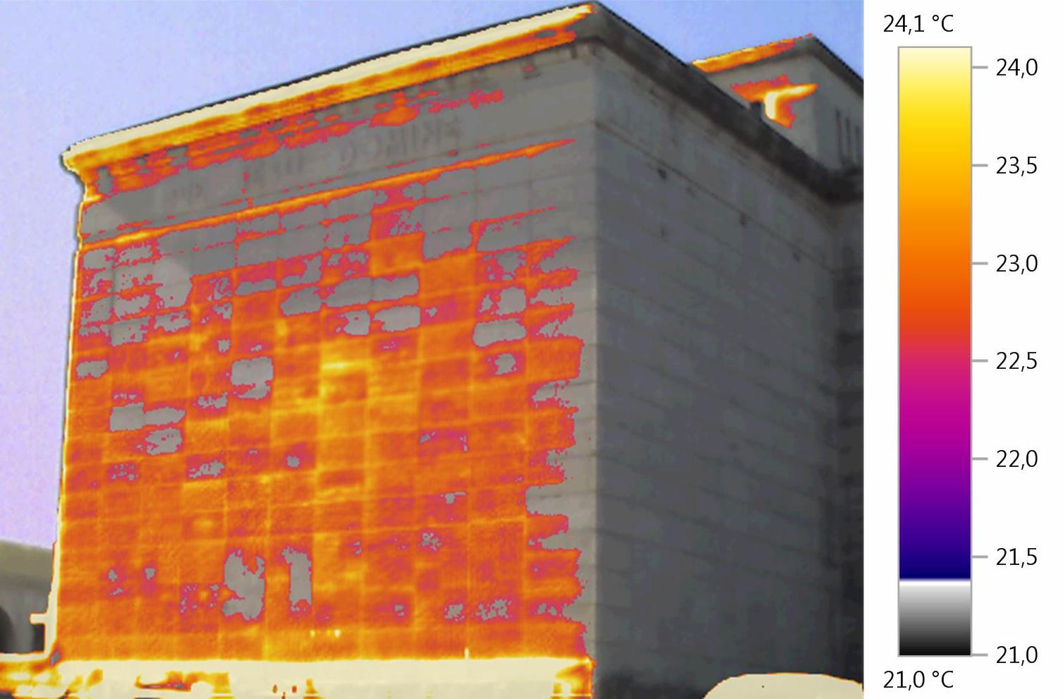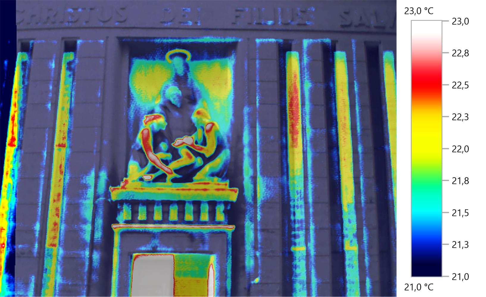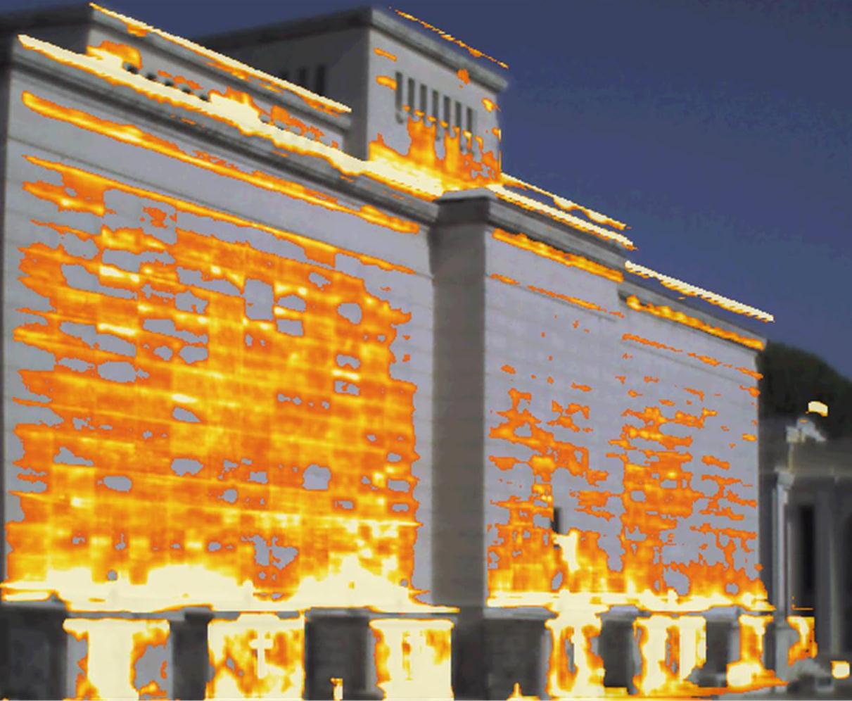 Studio delle patologie edilizie dei rivestimenti in pietra dei prospetti della Chiesa sita nel Cimitero Monumentale del Campo Verano appartenente alla Venerabile Arciconfraternita di Carità verso i Trapassati, e analisi ambientali interne dello stato termo igrometrico sui vari livelli. Analisi termografica per verifica dello stato di aderenza degli intonaci interni e dei rivestimenti in travertino esterni. Le analisi sono state eseguite nel tempo e le termografie nel transitorio termico e in piena irradiazione solare. All’interno della Chiesa sono stati installati dei termo igrometri per la verifica dello stato di temperatura e umidità dei vari livelli. Per quanto attiene alla termografia eseguita all’interno, è stato utilizzato, per il riscaldamento dei rivestimenti lapidei un cannone ad aria calda alimentato a gas. Termografia Arciconfraternita.